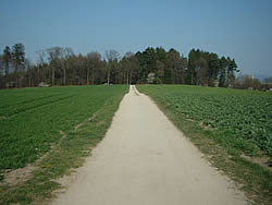 Biegen Sie auf der Hauptkreuzung im Weiler links ab und folgen dem Feldweg auf der Krete bis zum Wäldchen "Winterhale".